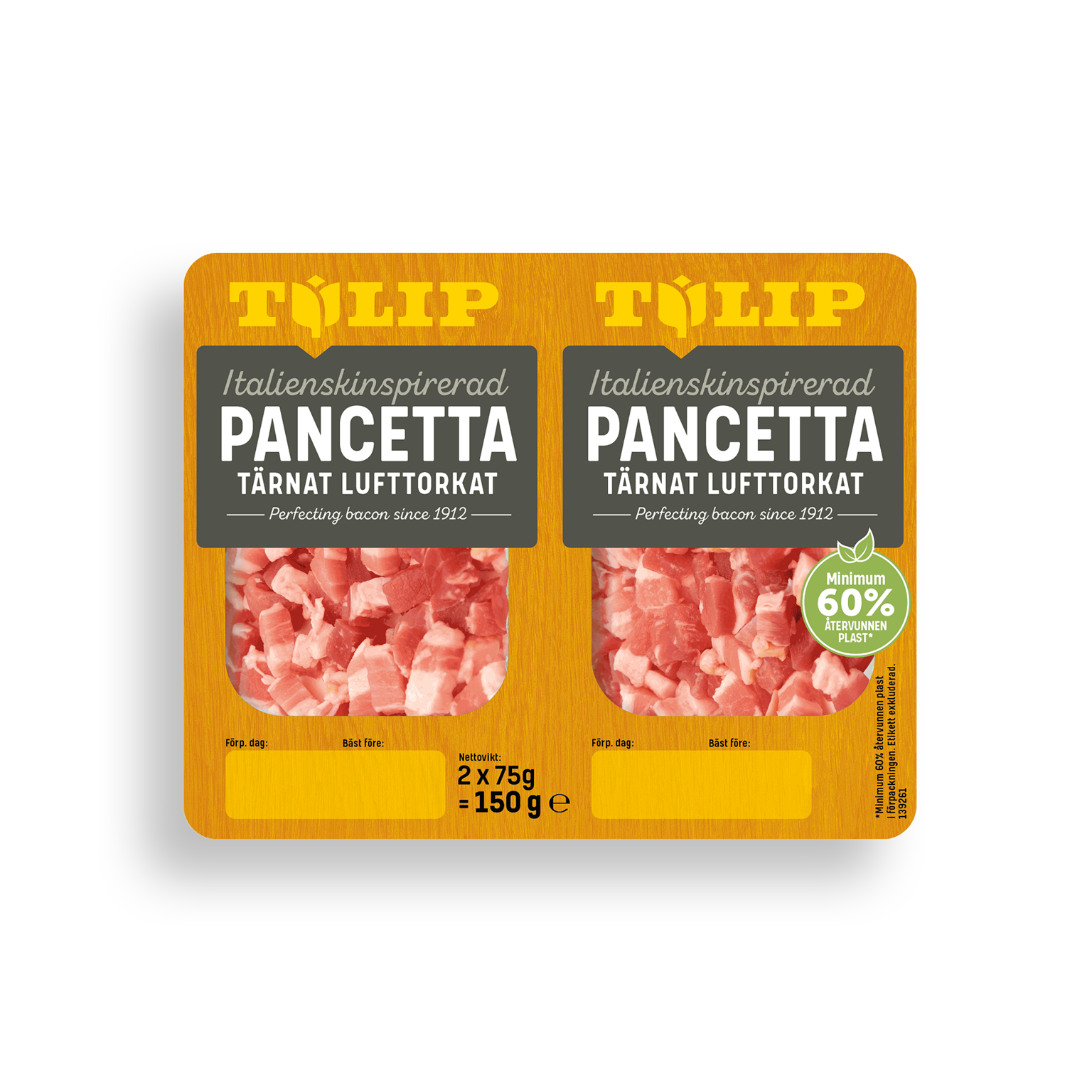 2x75 gTulip lanserer ternet Pancetta som er utviklet for det italienske markedet, men kan kjøpes i Norge. Emballasjen er en smart duo-pakke for å minimere matsvinn og er laget av 60% resirkulert plast. Nytes i en carbonara, pastarett, som en smaksforsterker eller i en salat.