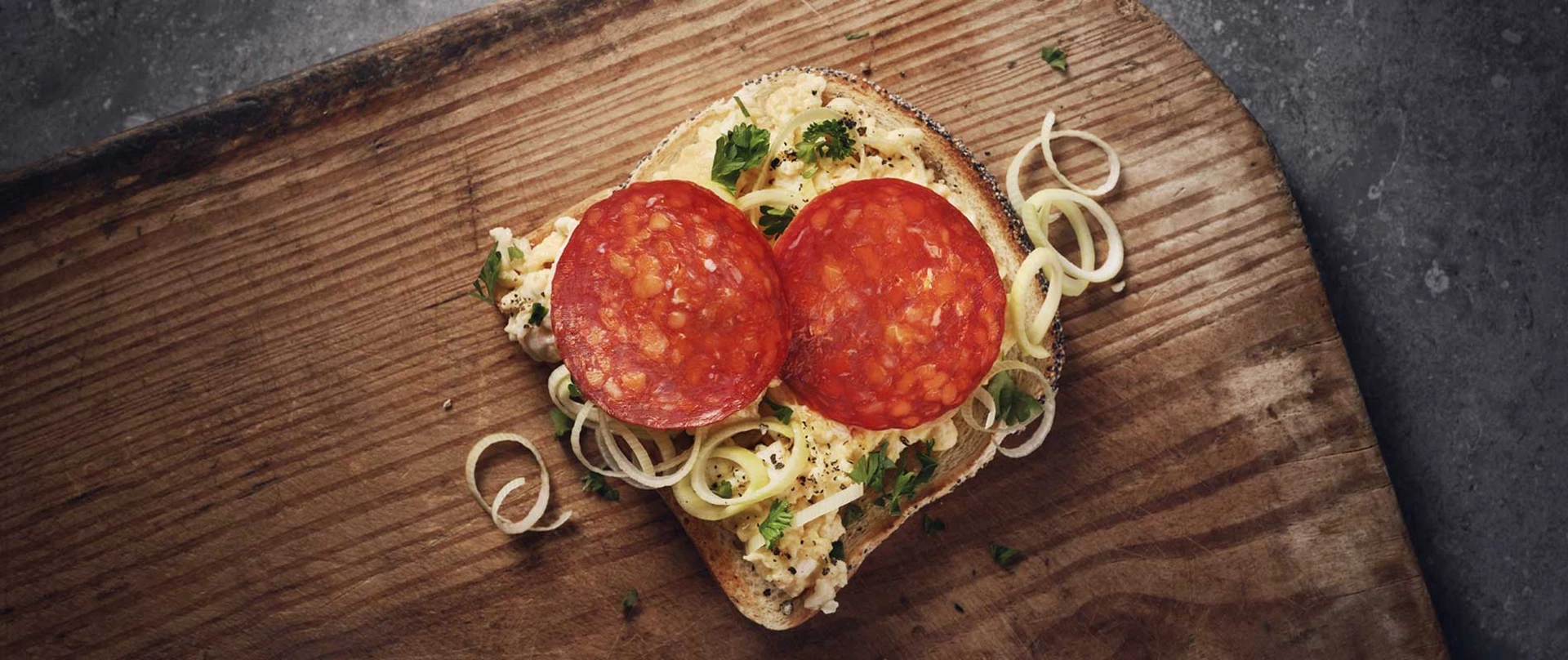 För många är det just frukosten som är favoritmåltiden på dygnet, då den kan varieras på många sätt. En smakfull frukostmacka kombineras med en krämig äggröra och toppas med chorizosalami.