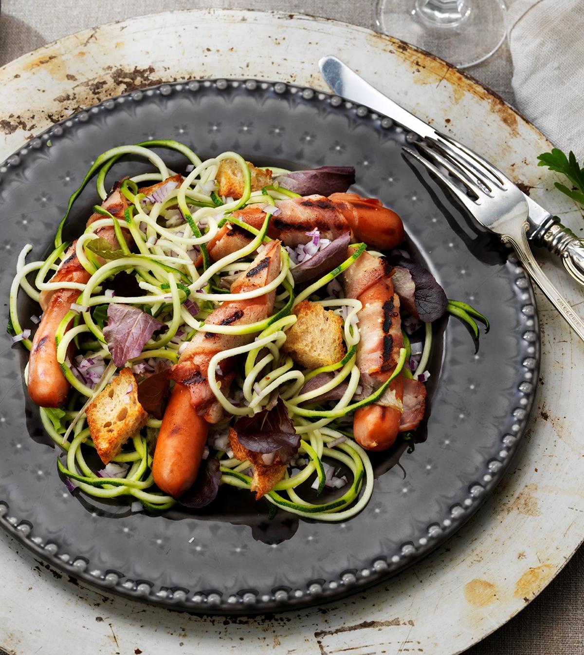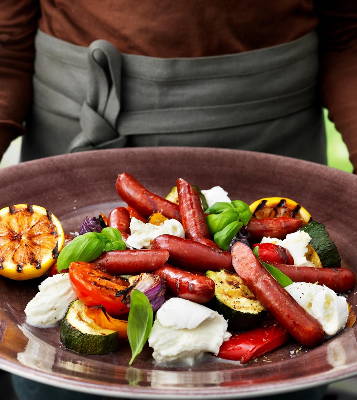 Bli inspirerad till sommarens grillkvällar med detta recept på grillade GØL-korvar serverade med frisk och fruktig sommarsallad med jordgubbar och grillade nektariner.