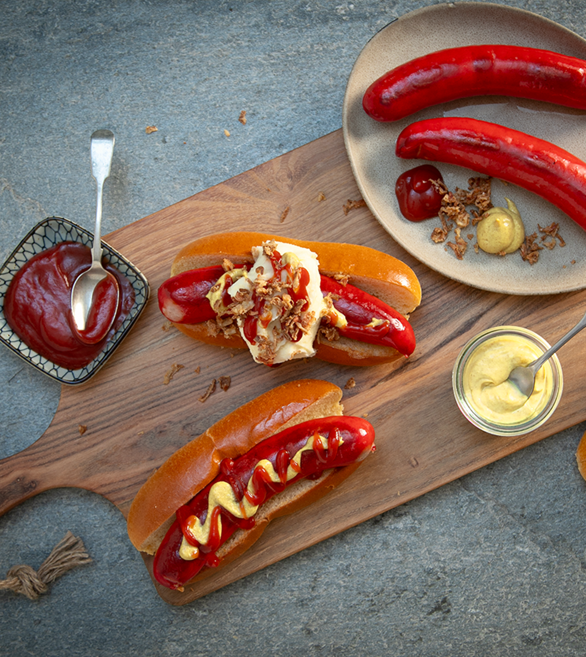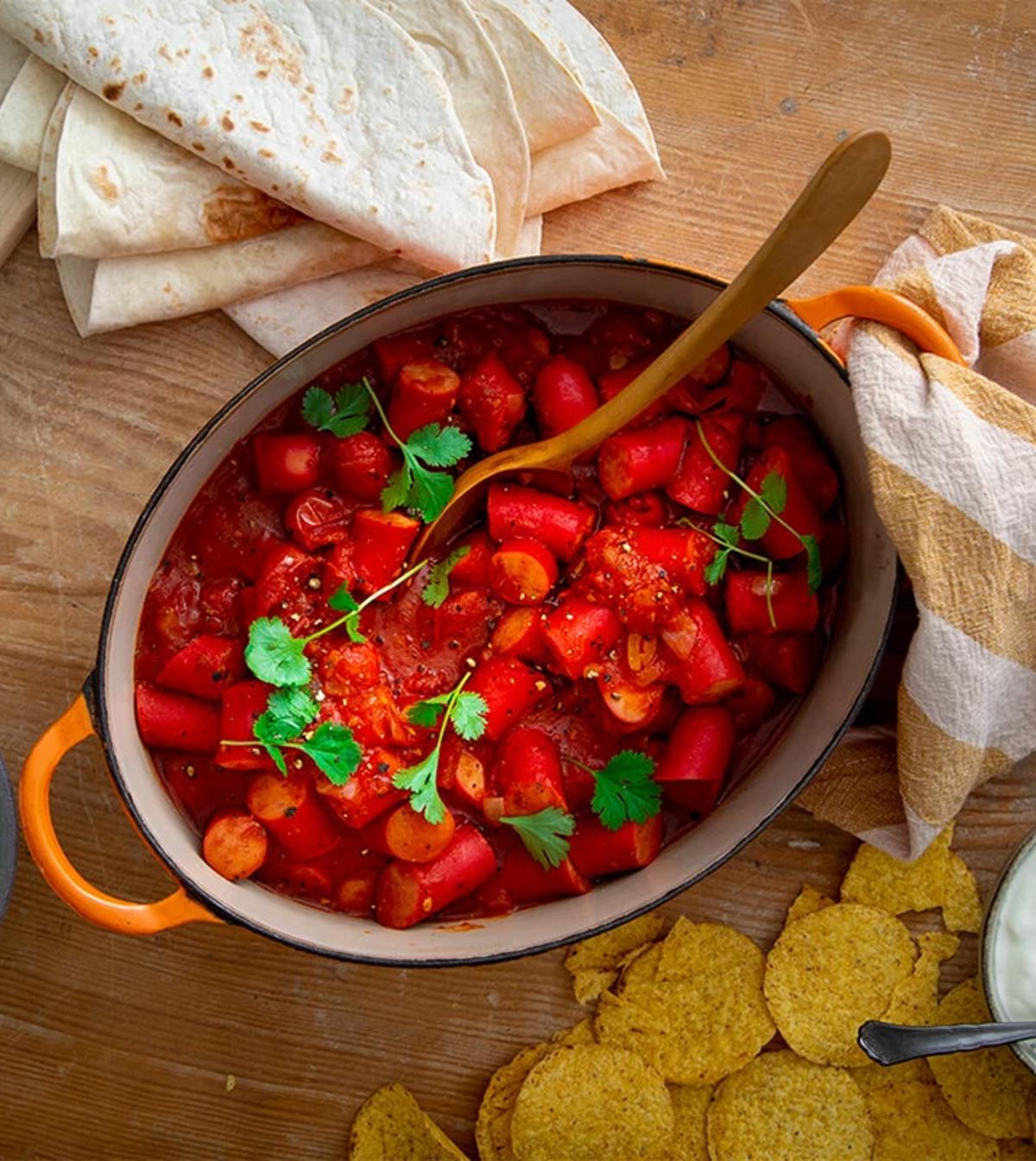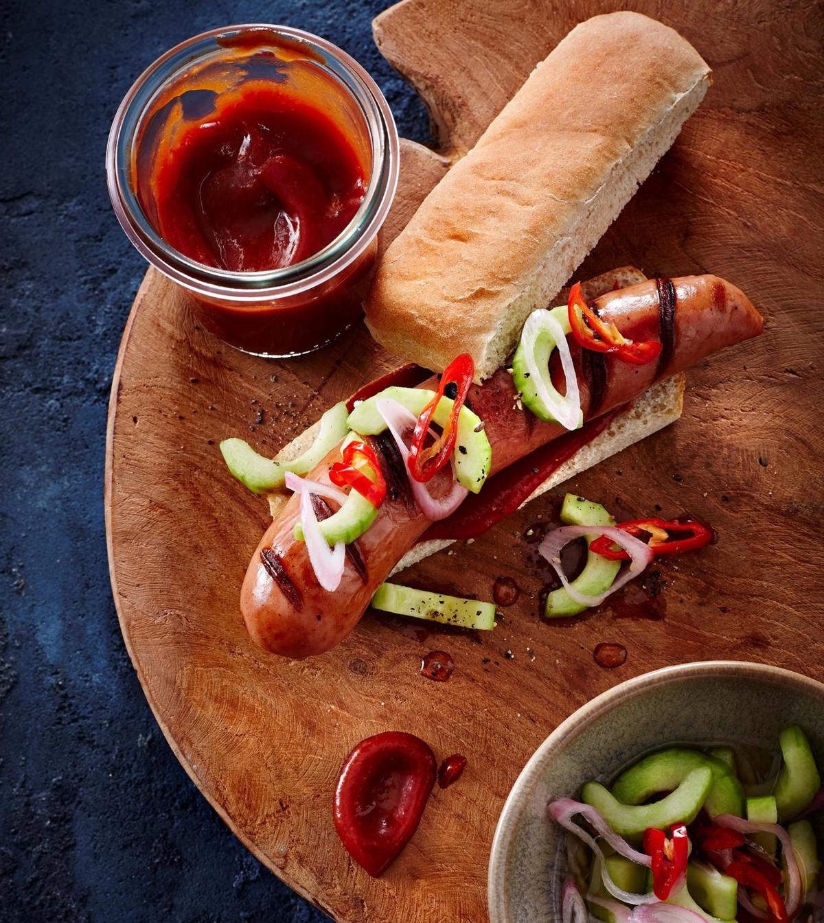 Röda hot dog pölser serveras i bröd med coleslaw med twist av äpple och chili! Perfekt sötma och hetta tillsammans med vår populära hot dog pölse. En korv är inte bara en korv. Den kan tillagas på många olika sätt! Korvrecept i sin enkelhet.