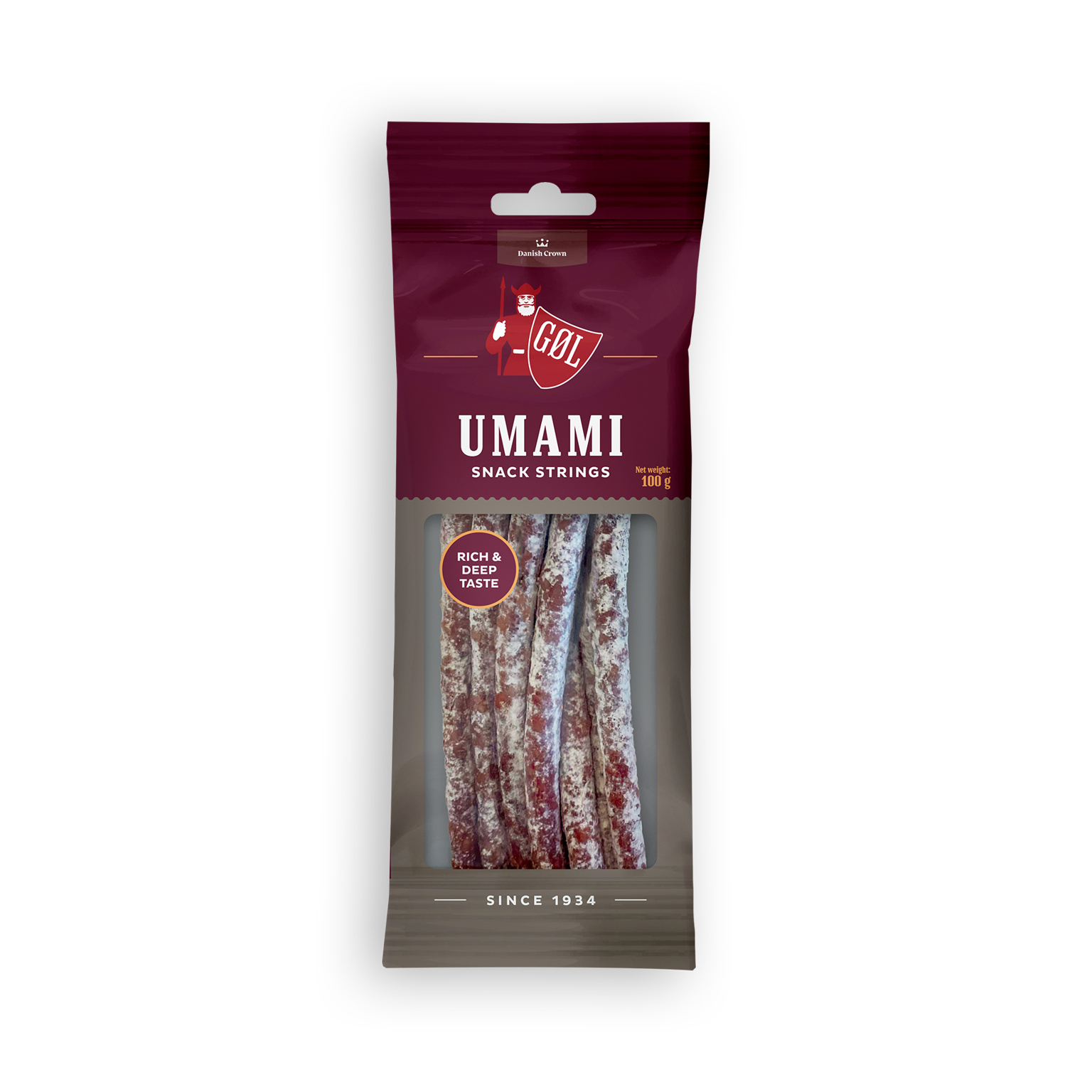 100 gGØL Snack strings Umami, en mild salami med balanserad djup smak med naturlig umami från svart tryffel. Två utvalda mögelstammar lyfter umamismaken ytterligare. Perfekt snack på tapasbordet eller att fylla på energin med när du är i farten.