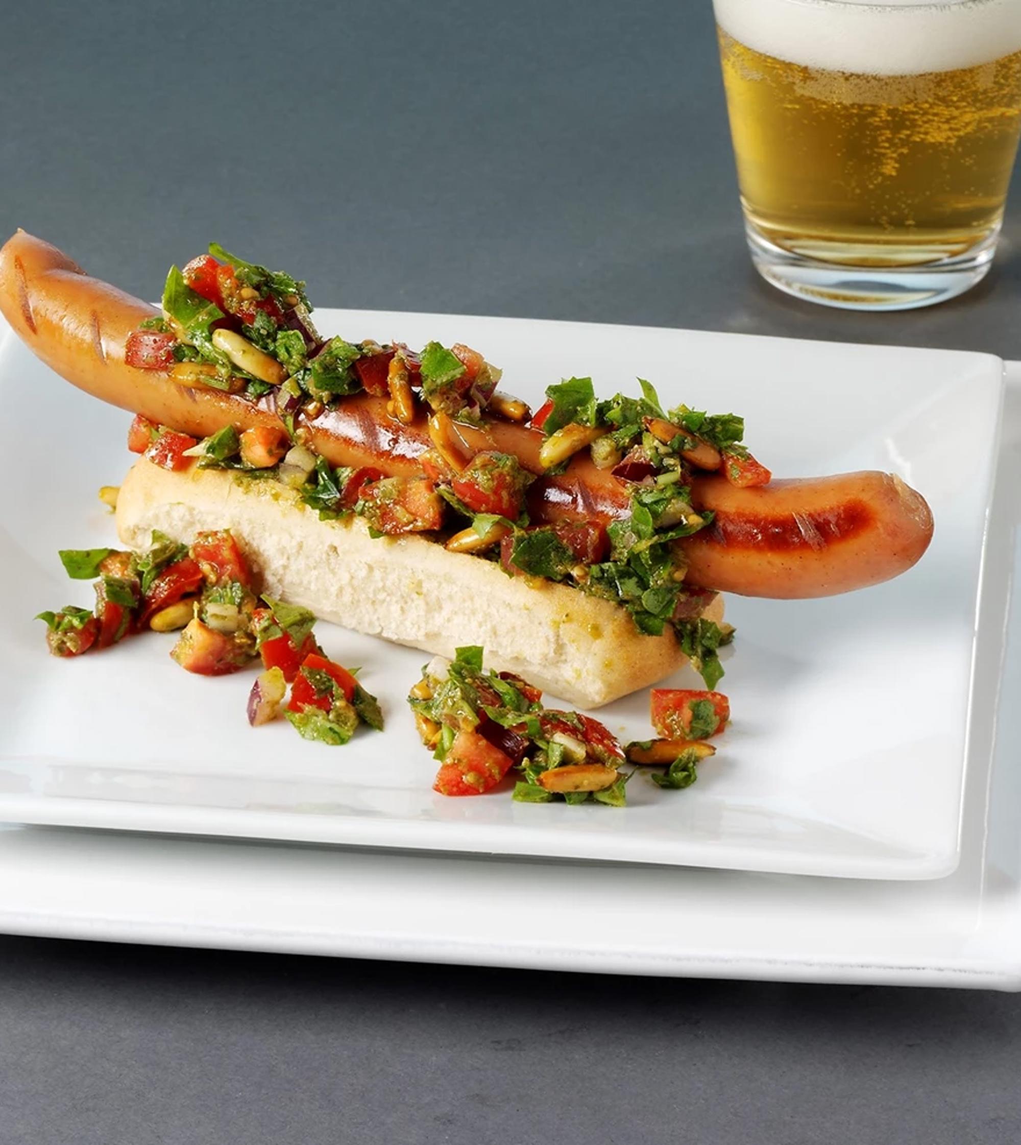 Grillkorv med salsa-pesto, rucola och pinjenötter
