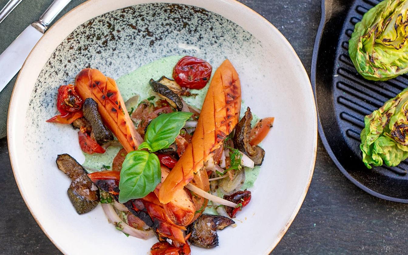 Cabanossy med grillad hjärtsallad och ugnsrostade grönsaker