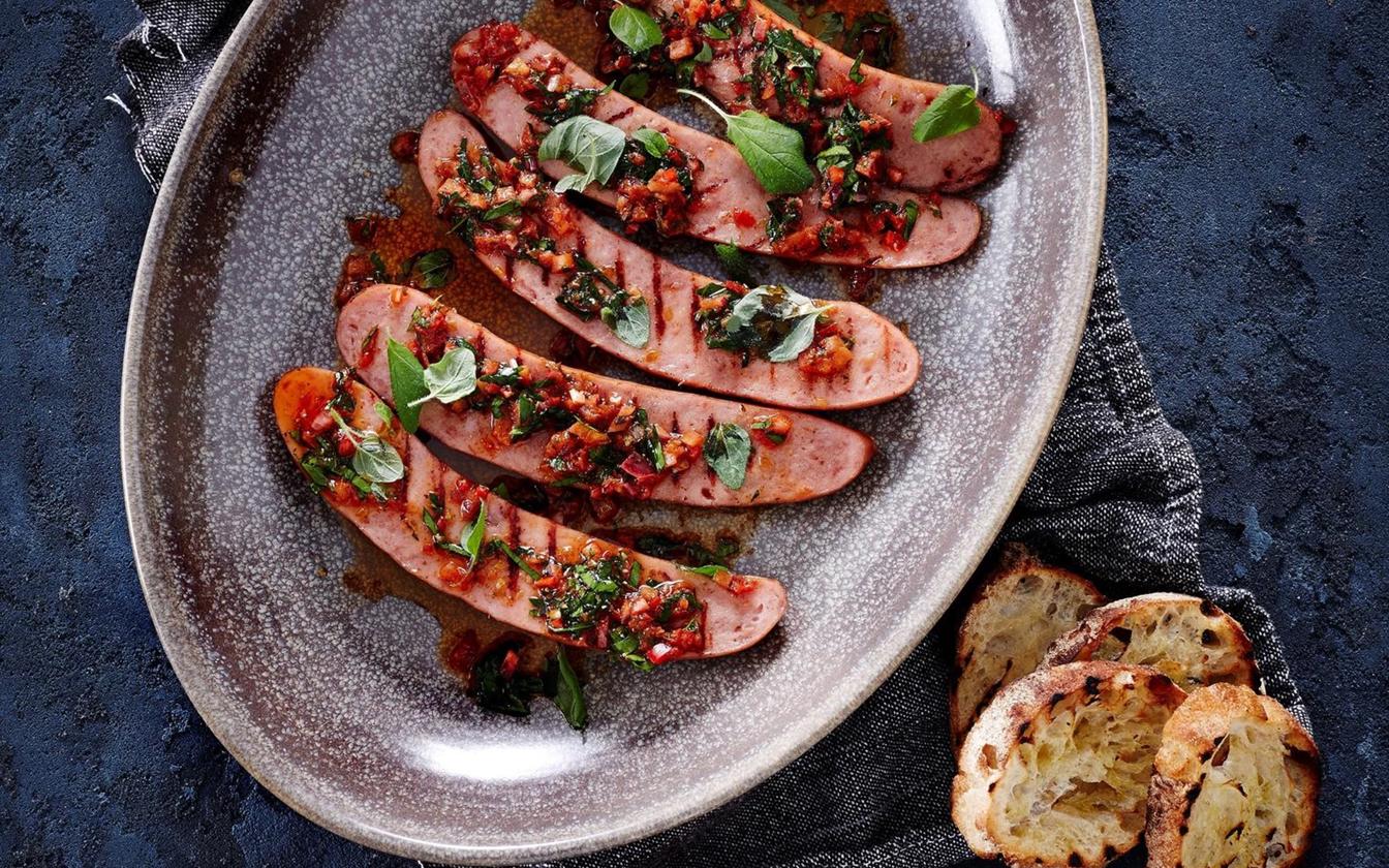 Det här är inget vanligt korv med bröd recept. Chimichurri är en smakrik sås eller marinad med ursprung från Sydamerika. Chimichurri kan användas som sås, marinad till kött och är fantastisk topping till en grillad korv. Vi har gjort en röd version av Chimichurri som serveras med het Cheddar chilikorv och surdegsbröd. Riktigt gott!