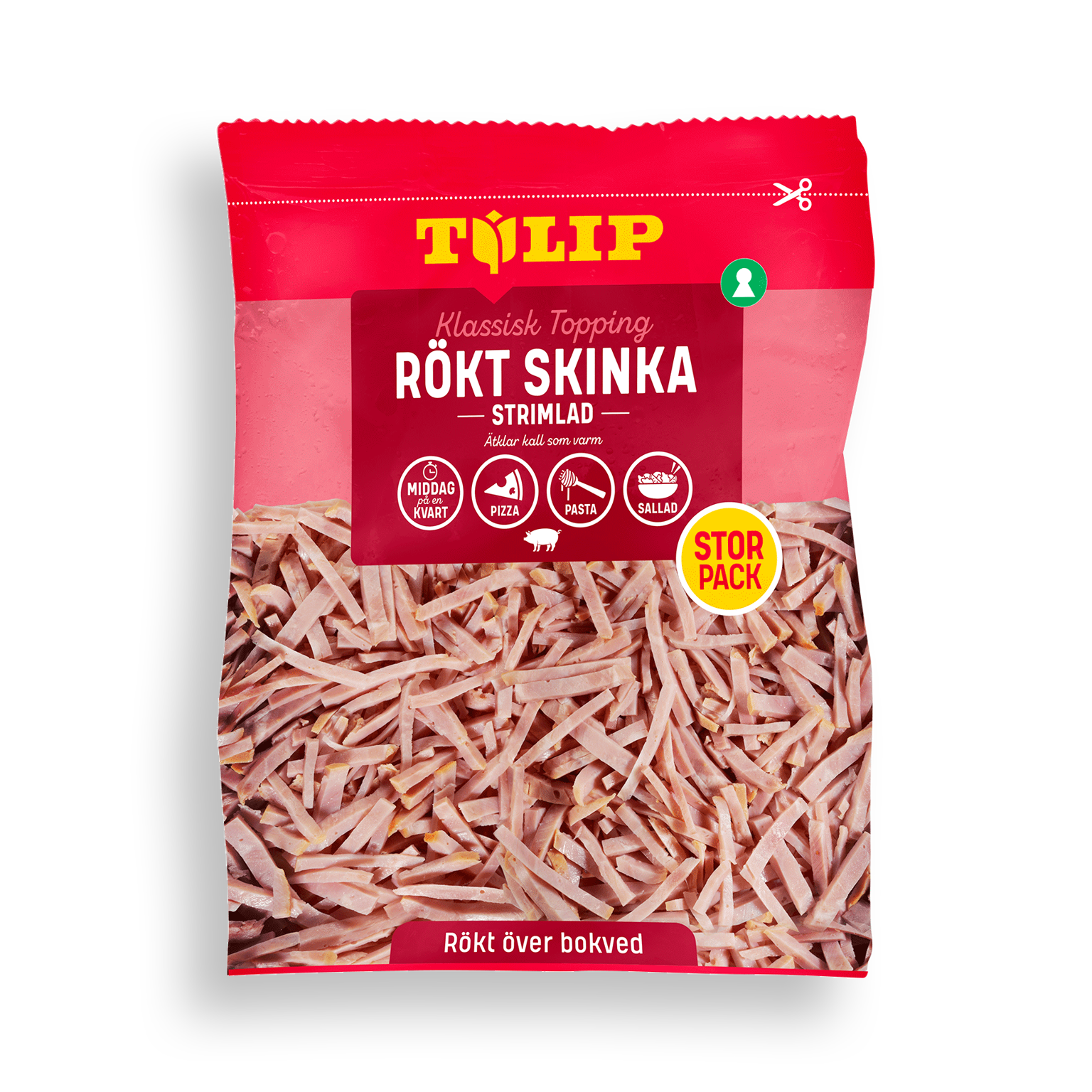 450 gBokvedsrökt och finstrimlad skinka, redo att ätas; varm eller kall. Passar perfekt för snabblagade måltider och är enkel att hantera. Använd som pizzatopping, fyllning till omelett, på varm smörgås, i gratäng, soppa eller sallad.