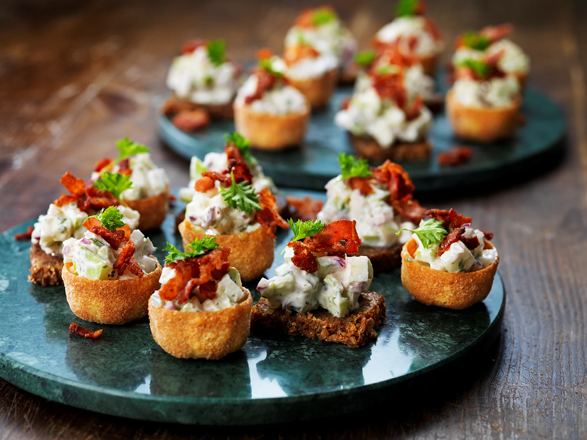 Knapriga krustader med krämig äppelröra och krispigt bacon – en enkel och smakrik förrätt eller tilltugg som passar perfekt till minglet.