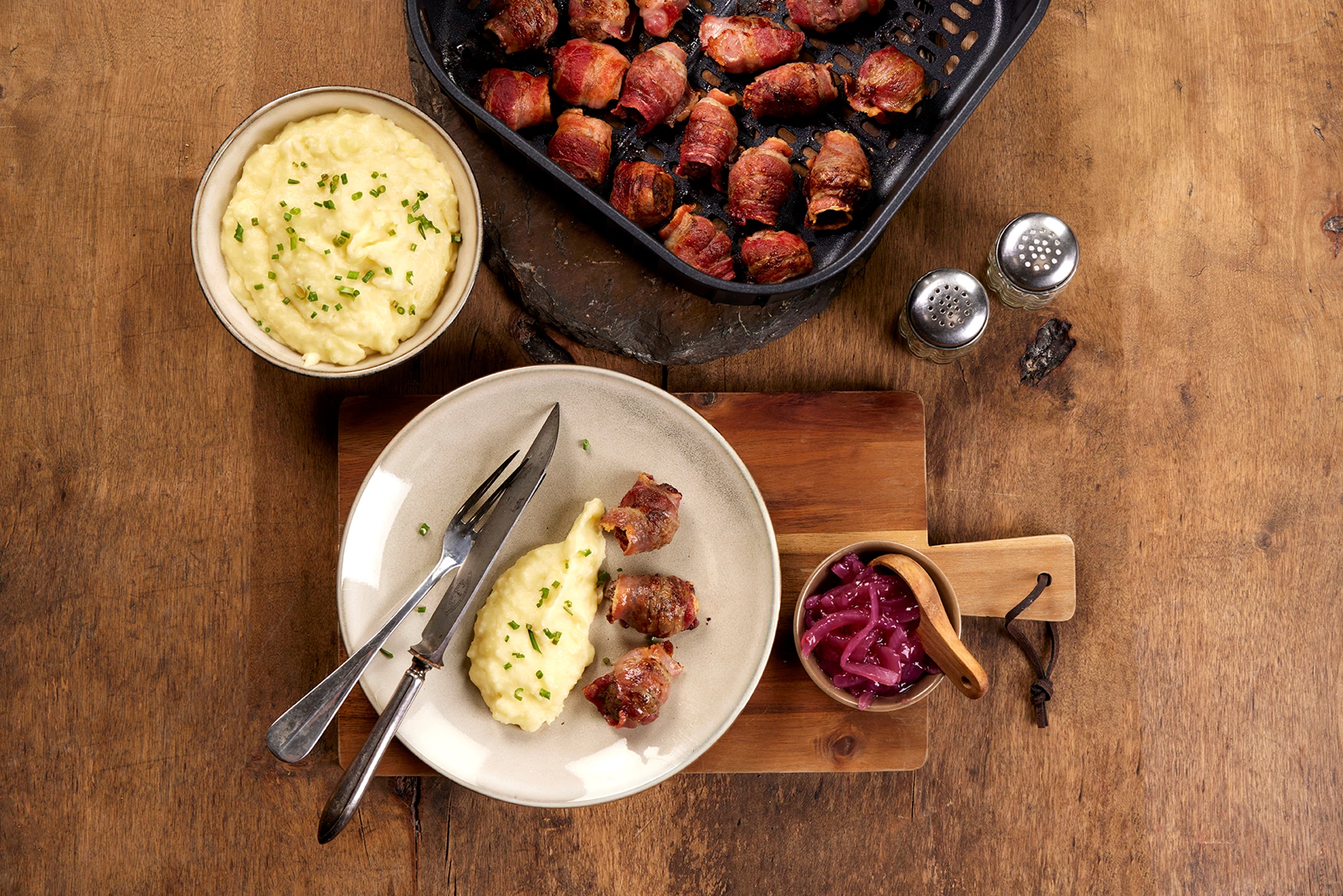 Utmana den klassiska köttbullar och potatismos med världens bästa smaksättare - BACON! Dessutom tillagar vi detta i airfryer, vilket ger en krispig yta och saftig mitt!