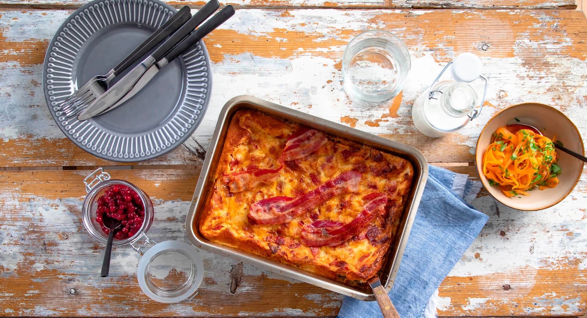 Den här baconpannkakan är en rustik klassiker med en modern twist. Krispig bacon bakas in i en luftig ugnspannkaka och serveras med en frisk morotssallad och syrliga lingon som ger balans åt smakerna. En perfekt rätt för en mysig vardagsmiddag eller helgbrunch!
