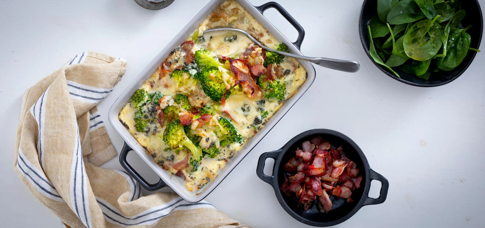 En gratäng innehållandes broccoli och bacon skapar tillsammans här en maträtt med riklig sälta och härlig konsistens.