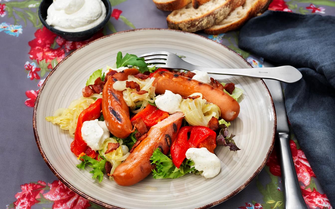 Bjud på en modern och smakrik twist på den klassiska grillkorven! Här kombineras saftig tjock grillkorv med karamelliserad lök, rostad paprika, senapscrème och krispigt bacon – allt serverat med fräsch sallad. En perfekt rätt till sommarens grillkvällar eller när du bara vill lyxa till det lite extra med enkla medel.