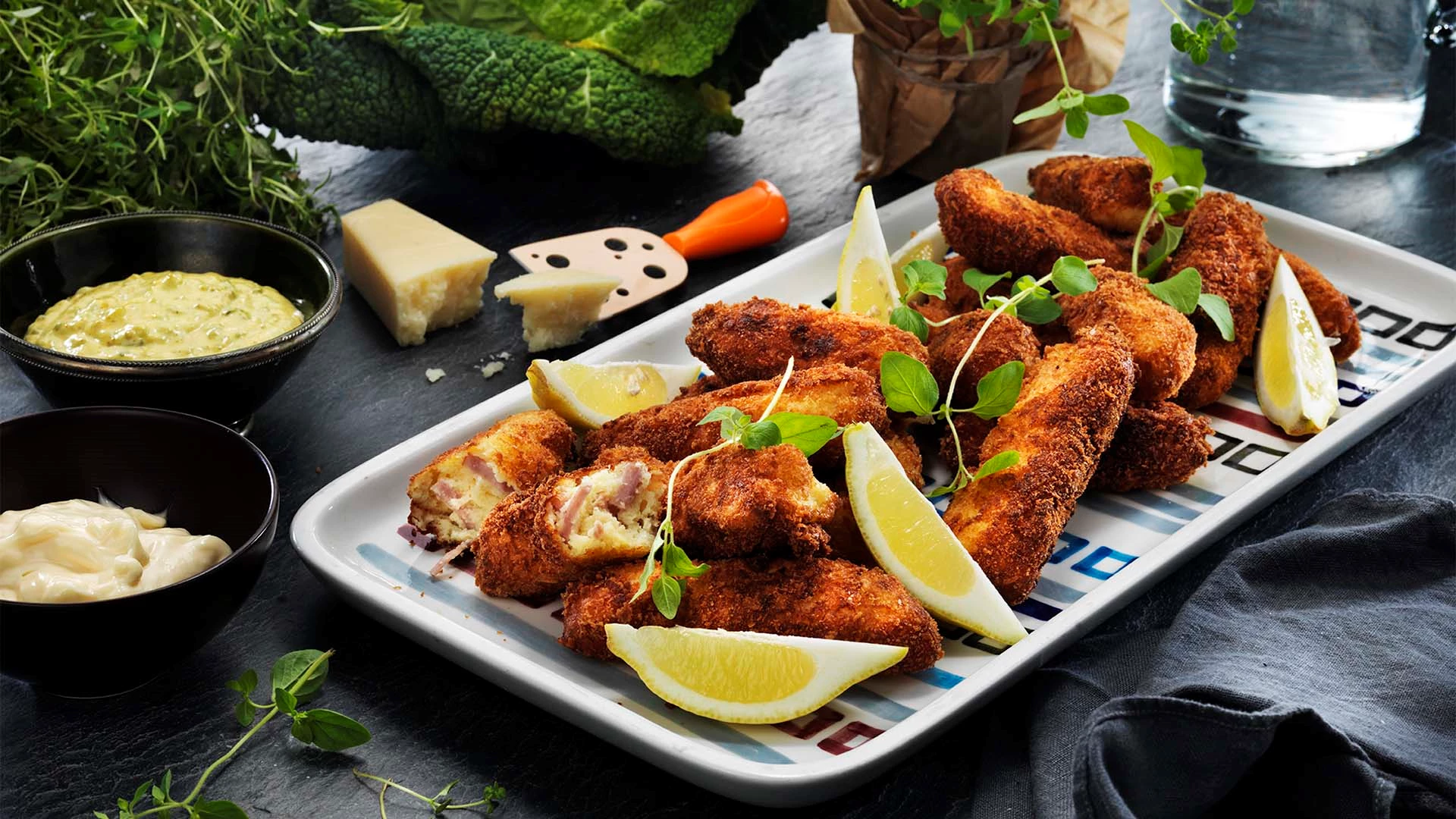 Sugen på att laga lite tapas? Då borde du testa våra pankofriterade potatiskroketter med strimlad skinka och parmesan. Friterade potatiskroketter är en favorit bland de spanska tapasrätterna, men fungerar lika bra som tillbehör till grillkvällen eller som snacks före middagen.