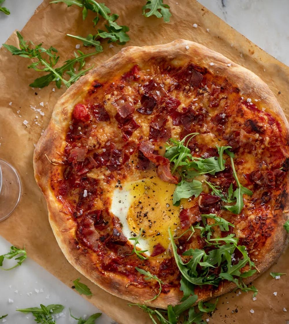 Pizza bianco görs utan tomatsås, här tillsammans med bacon och potatis.