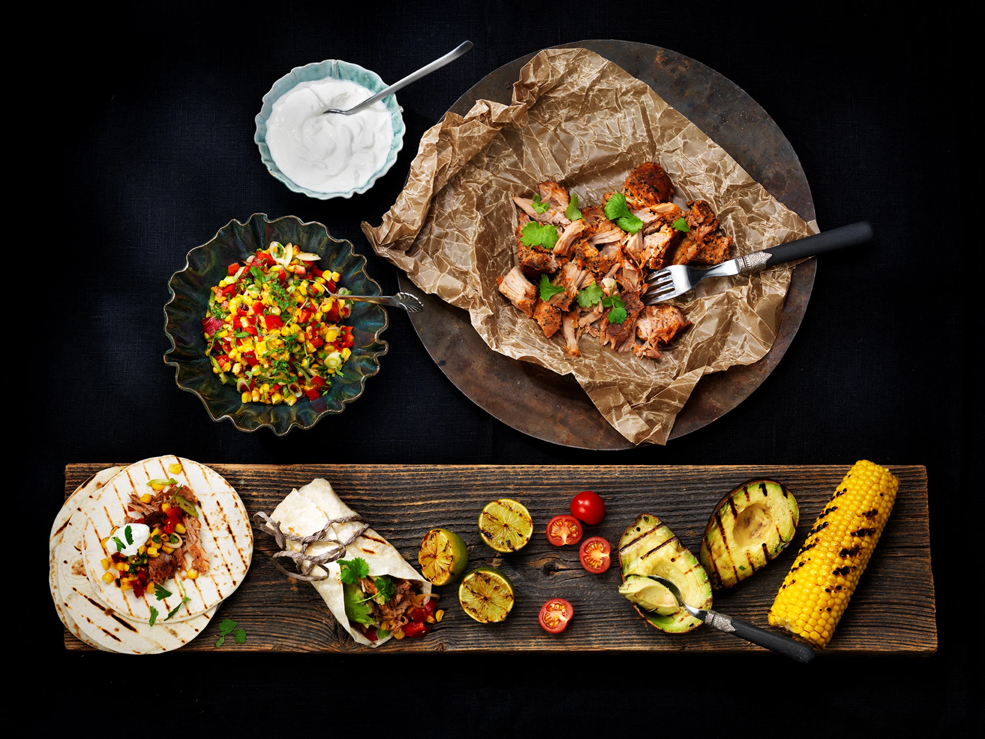 Pulled pork med grillad avokado och majssalsa