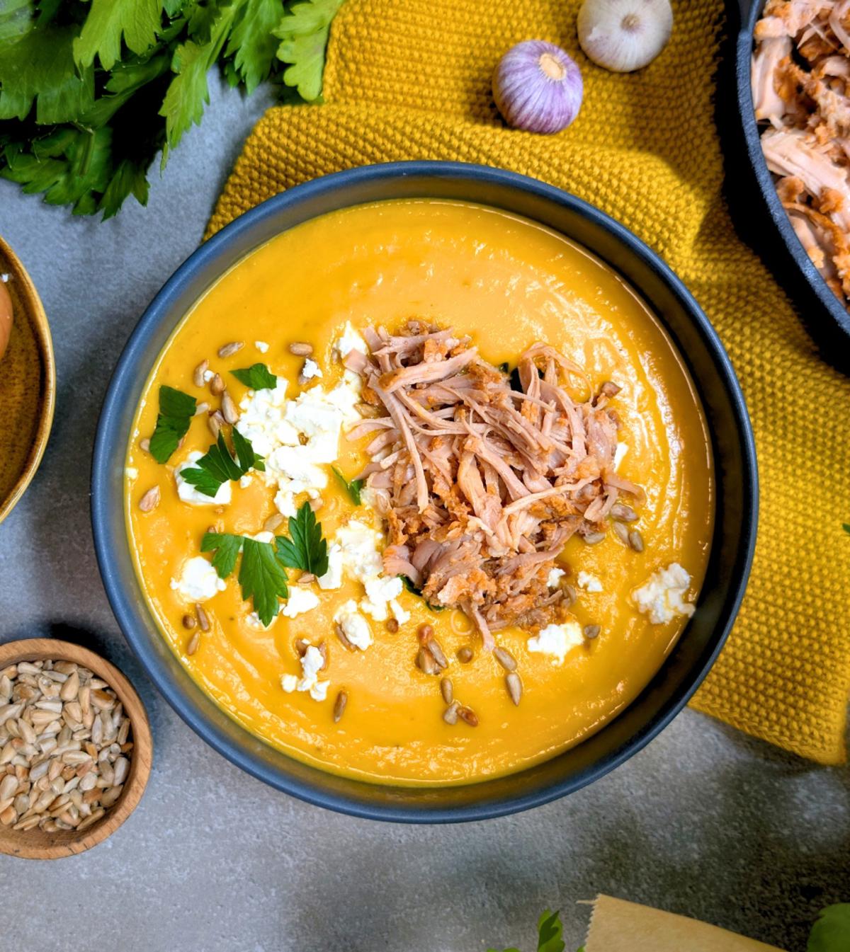 Pumpasoppa med pulled pork är en perfekt kombination av sött och salt. Den krämiga pumpasoppan blir ännu godare när den toppas med smakrik pulled pork. Denna härliga höstmåltid passar perfekt som förrätt eller huvudrätt och är enkel att göra.